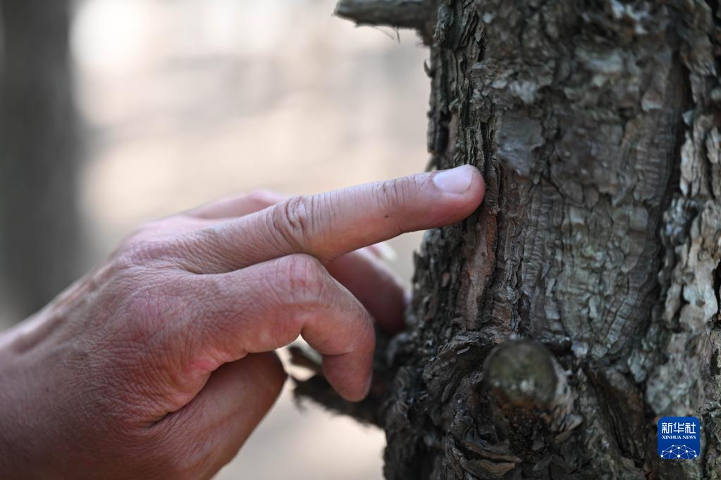 3月10日,在五河縣朱頂鎮陸沖山的山林中,張偉在檢查樹木的病蟲害情況。