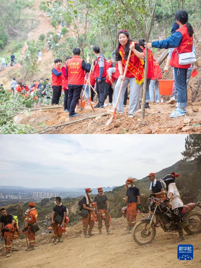 這是一張拼版照片:(上圖)3月10日,在位于重慶市璧山區八塘鎮陽龍村的縉云山腳下,“蝴蝶結女孩”吳樸慧(右二)在進行植樹活動。(下圖)2022年8月23日,吳樸慧(右一)和救援人員一起奮戰在縉云山抗擊山火的第一線,頭盔上的紅色蝴蝶結成為她獨特的標志。