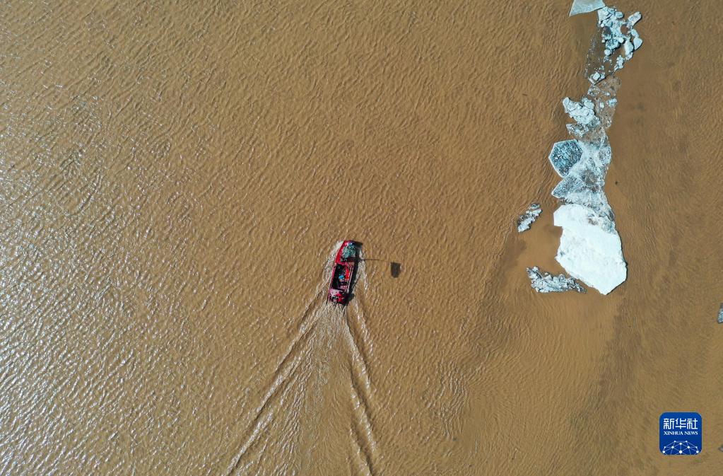 3月11日,在呼和浩特市托克托縣,一艘船在黃河水面上航行(無人機照片)。