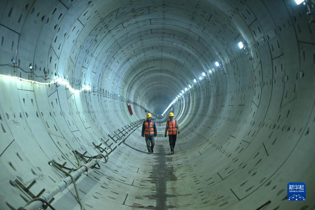 3月7日,工作人員走在貫通后的合肥軌道交通4號線南延線盾構隧道內。