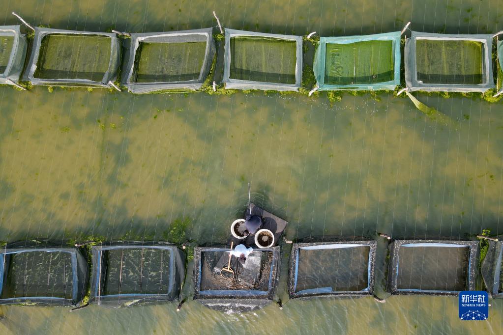 3月9日,在安徽省蚌埠市五河縣申集鎮,蟹農從網箱中撈出培育好的蟹苗(無人機照片)。
