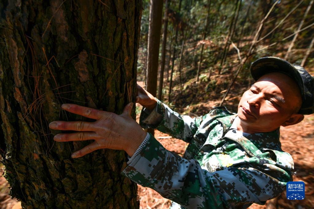 3月9日,黃同維在林區巡山時,用手量一棵松樹的直徑。