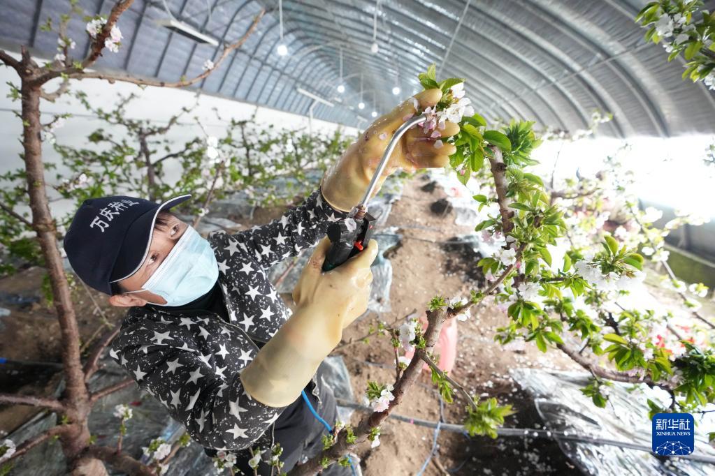 3月9日,在黑龍江省佳木斯市郊區現代農業產業園區棚室內,工作人員在給櫻桃樹人工授粉。