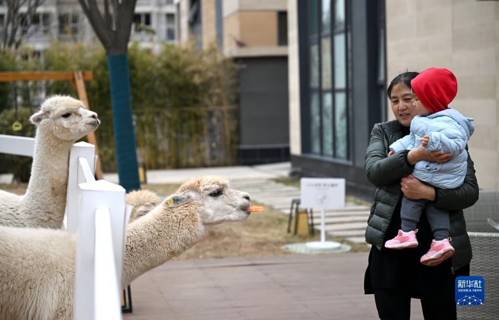 3月11日,在天津市薊州區“eden春山里”生態教育國際生活示范區,游客在和羊駝互動。