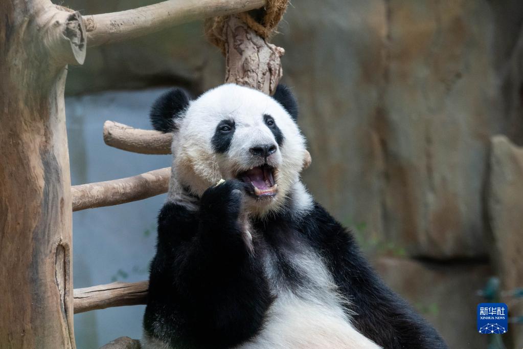 3月11日,在馬來西亞吉隆坡,大熊貓“誼誼”在進食。