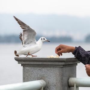 3月12日,一名游客在昆明海埂大壩喂紅嘴鷗。