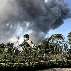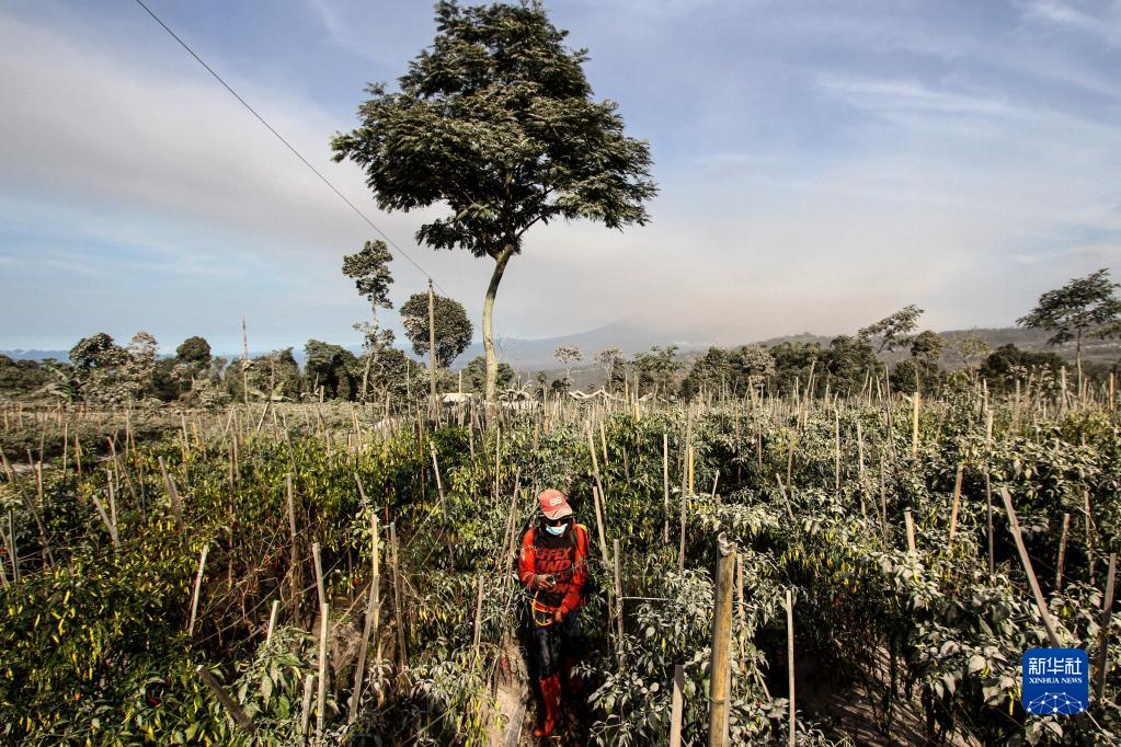 3月12日,在印度尼西亞博約拉利,一名農民向受火山灰影響的辣椒噴水。