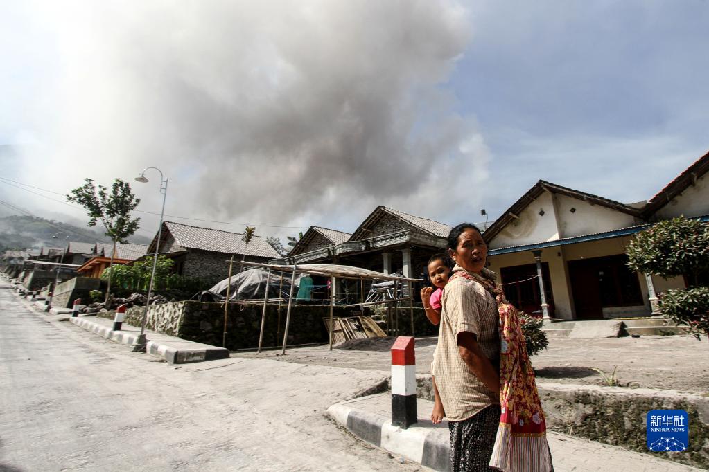 3月12日,在印度尼西亞博約拉利,一名女子抱著孩子站在房屋前,遠處是默拉皮火山噴發的火山灰。