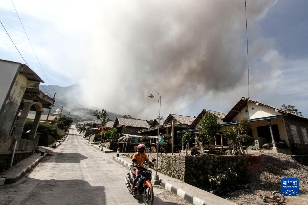 3月12日,在印度尼西亞博約拉利,一名男子騎摩托車駛過村莊,遠處是默拉皮火山噴發的火山灰。