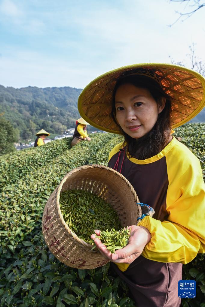 3月13日,龍井村的茶農徐雅軍在展示剛剛采摘的西湖龍井鮮葉。