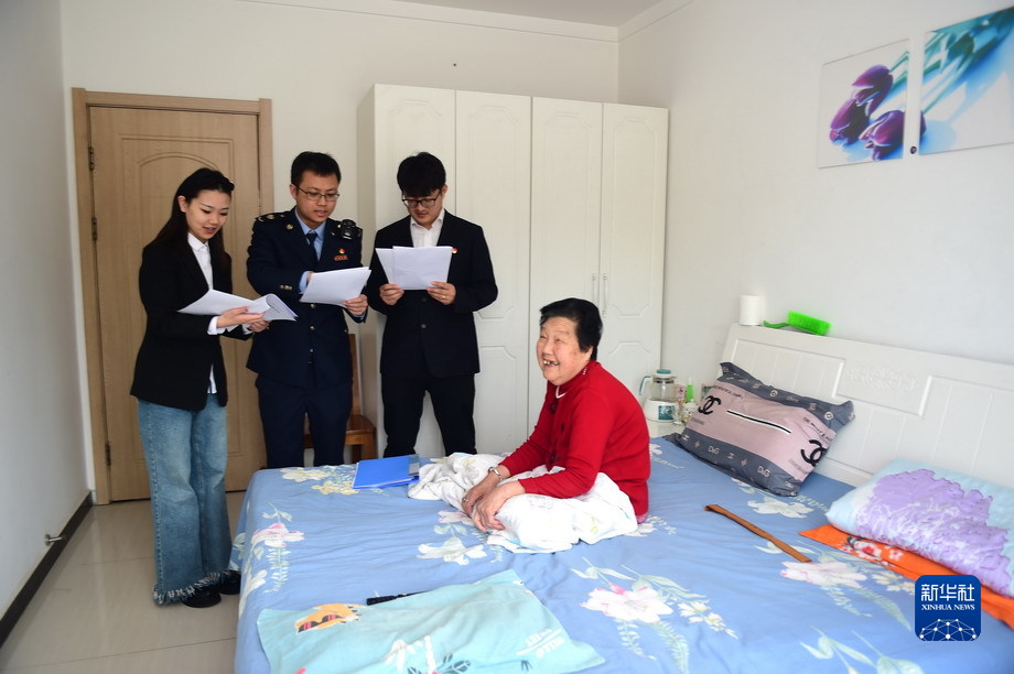 3月13日,國家稅務總局青縣稅務局的工作人員(后中)與住房和城鄉建設、自然資源和規劃職能部門的工作人員攜帶相關表證單書,上門為88歲行動不便的老人劉長俊,辦理房產交易業務。新華網 發(劉一瑋 攝)
