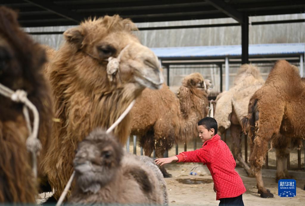 新疆莎車縣米夏鎮的牛羊巴扎上,一名兒童在觀看駱駝(3月12日攝)。