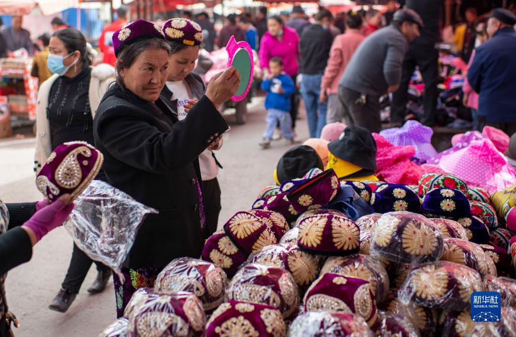 人們在新疆莎車縣的綜合巴扎上選購花帽(3月12日攝)。