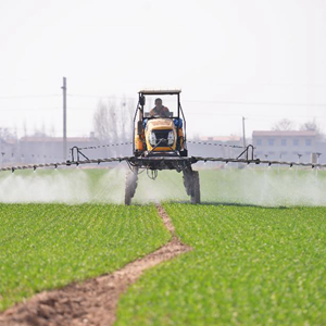 3月14日,河北省晉州市槐樹鎮北白水村一家農業合作社的社員在操作機械設備給冬小麥噴灑農藥(無人機照片)。