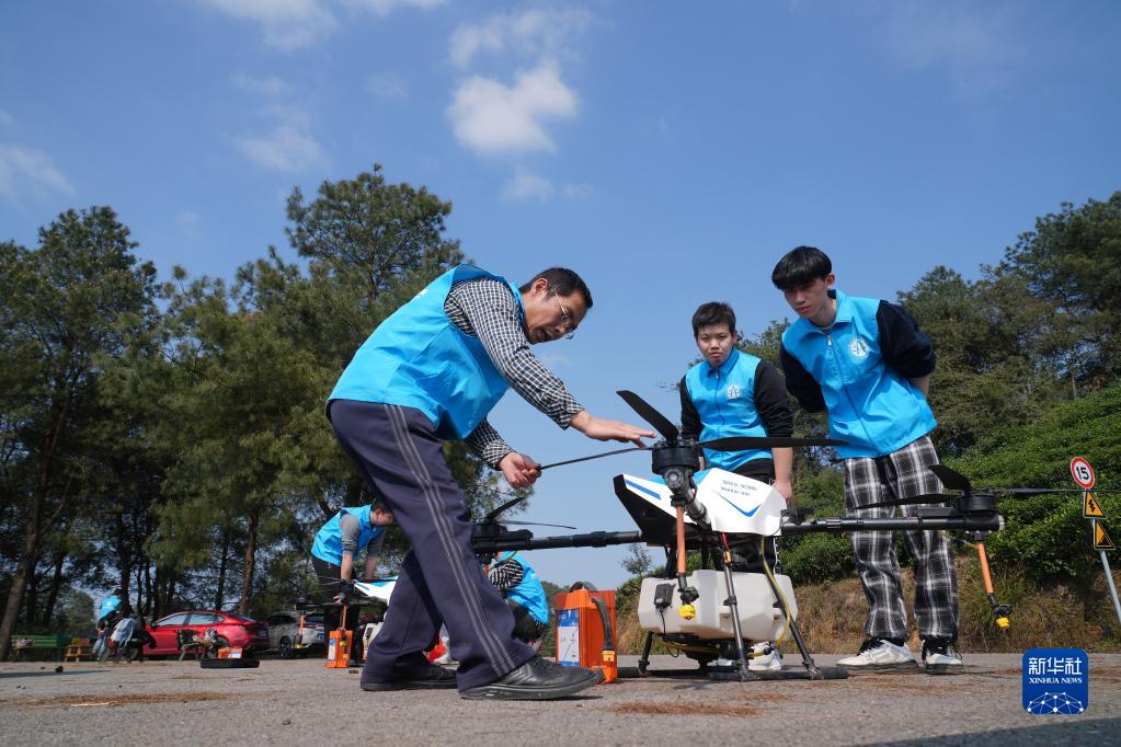 3月14日,在重慶市北碚區天府鎮代家村青峰茶場,重慶海聯職業技術學院無人機專業教師指導學生進行植保無人機飛防作業前的檢查。