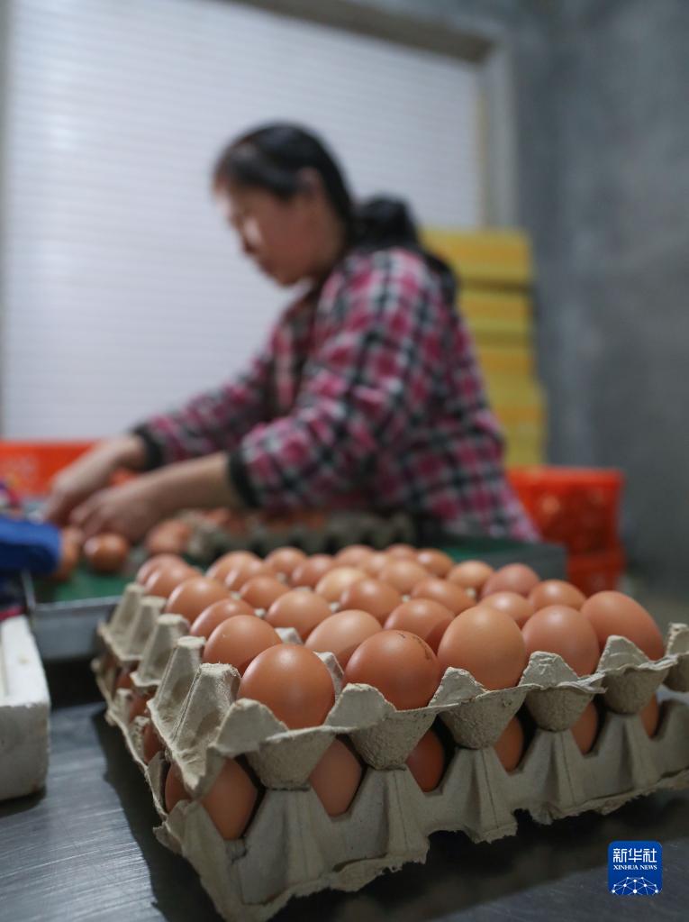 3月14日,在位于岫巖縣牧牛鎮的遼寧巖海牧業有限公司產蛋一車間,工作人員將雞蛋裝盒。