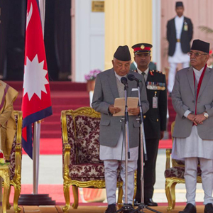 3月13日,尼泊爾總統拉姆·昌德拉·鮑德爾(前右)在加德滿都參加就職儀式。尼泊爾當選總統鮑德爾13日宣誓就職。