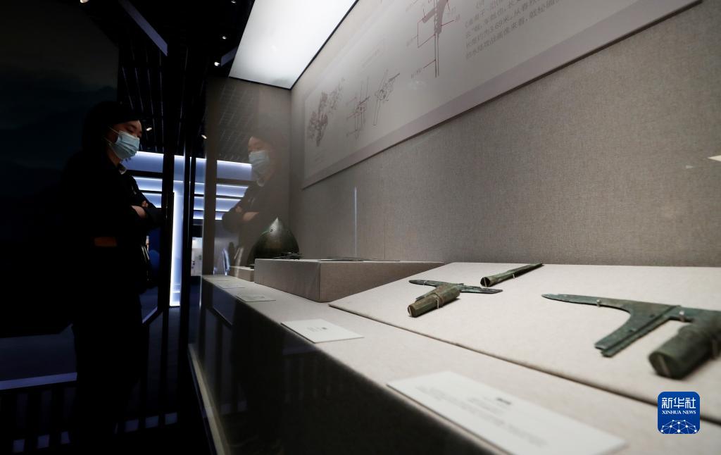 3月14日,參觀者在一組青銅兵器展品前駐足觀看。