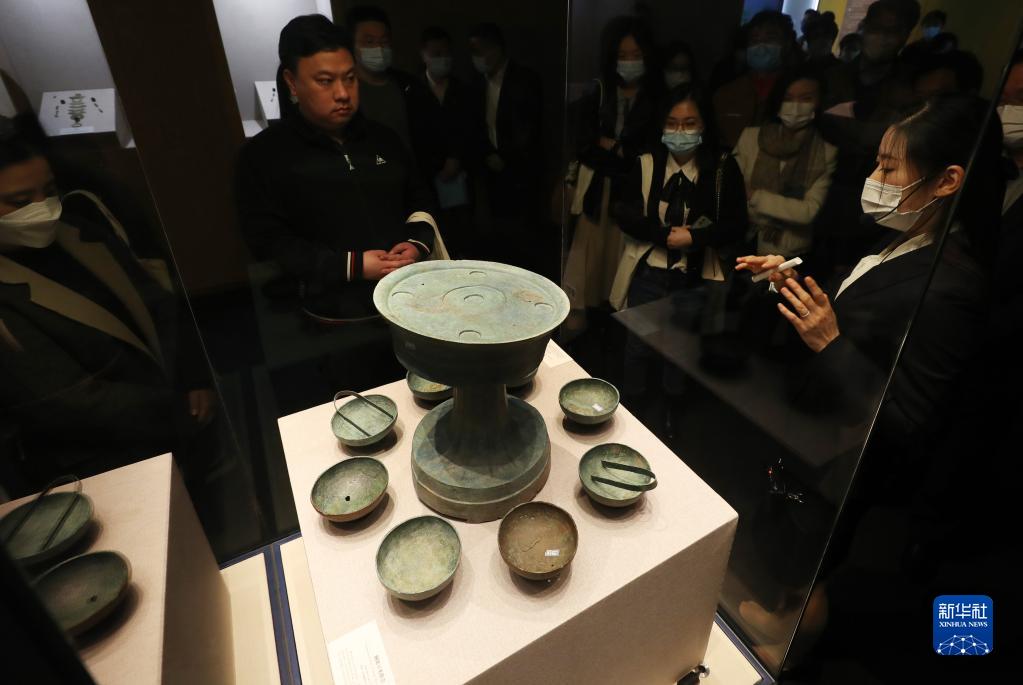 3月14日,參觀者在戰國銅俎豆夾組合展柜前駐足觀看。