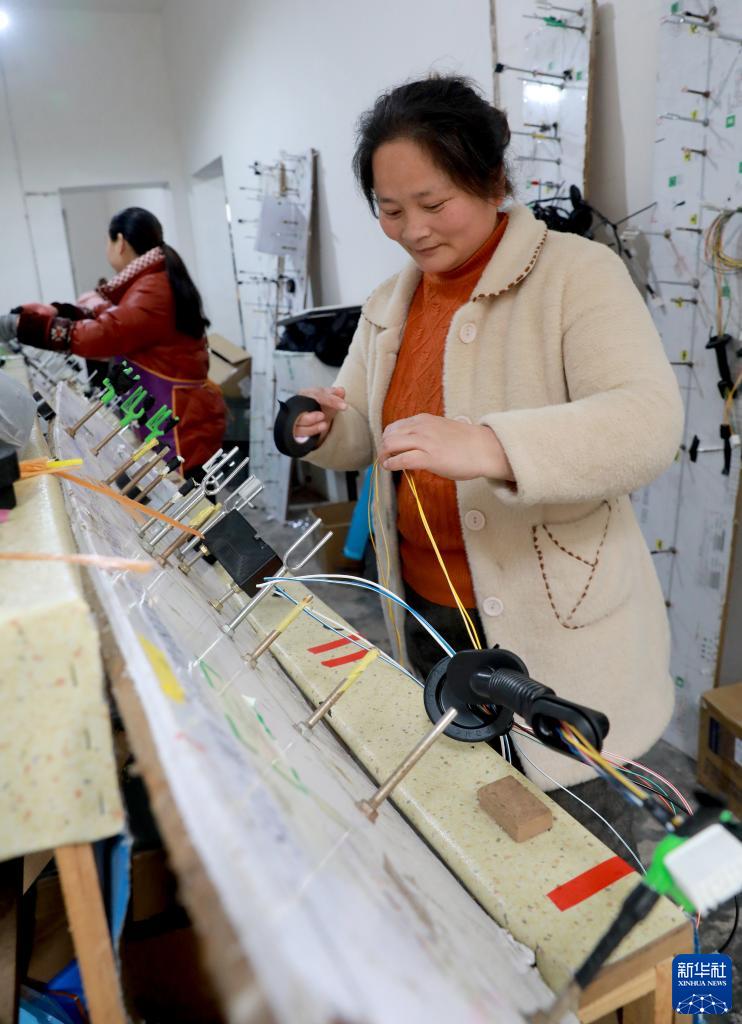 3月14日,四川省華鎣市明月鎮汽車配件“微車間”里,女工在纏繞汽車線束。