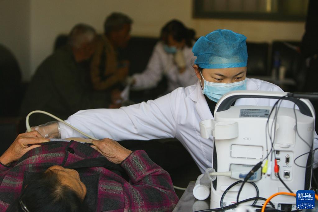 3月14日,在曲靖市沾益區龍華街道龍泉社區,醫護人員為老年人進行B超檢查。