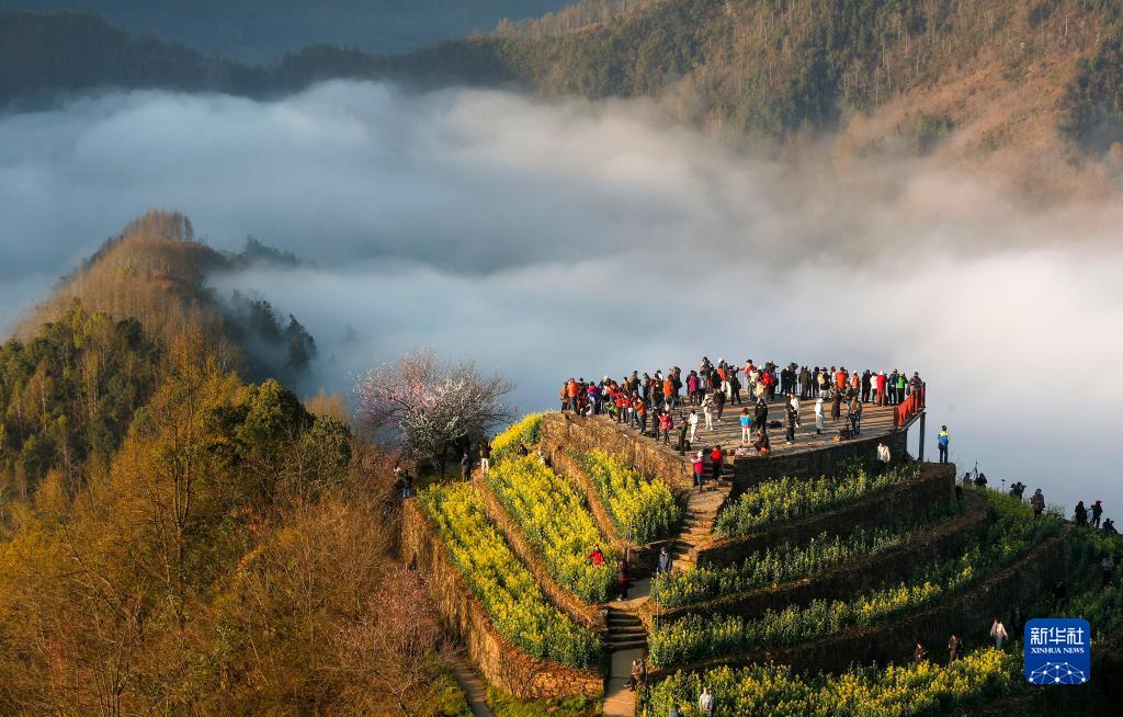 3月14日,游人在欣賞云海美景(無人機照片)。