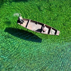 湖北省恩施土家族苗族自治州鶴峰縣容美鎮屏山村屏山旅游景區河水清澈見底,舟行水上如懸浮空中,美如畫卷。