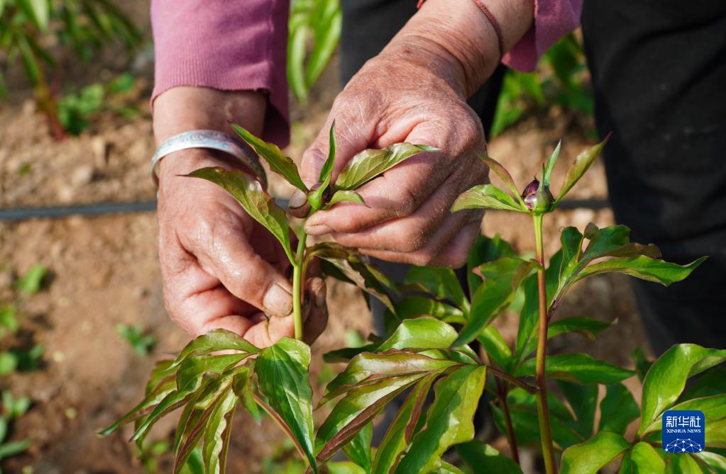 3月14日,在山東省菏澤市牡丹區黃堽鎮,花農為成長期的芍藥花蕾摘除側蕾以保障主蕾的質量。