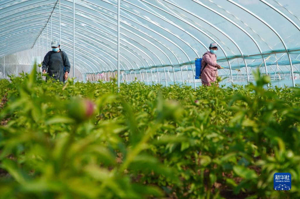 3月14日,在山東省菏澤市牡丹區黃堽鎮,花農為芍藥噴施葉面肥。