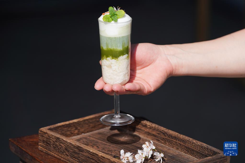 這是3月9日在安徽省黃山市德茗舍茶藝職業培訓學校里拍攝的“新中式茶調飲”——“北海新綠”。