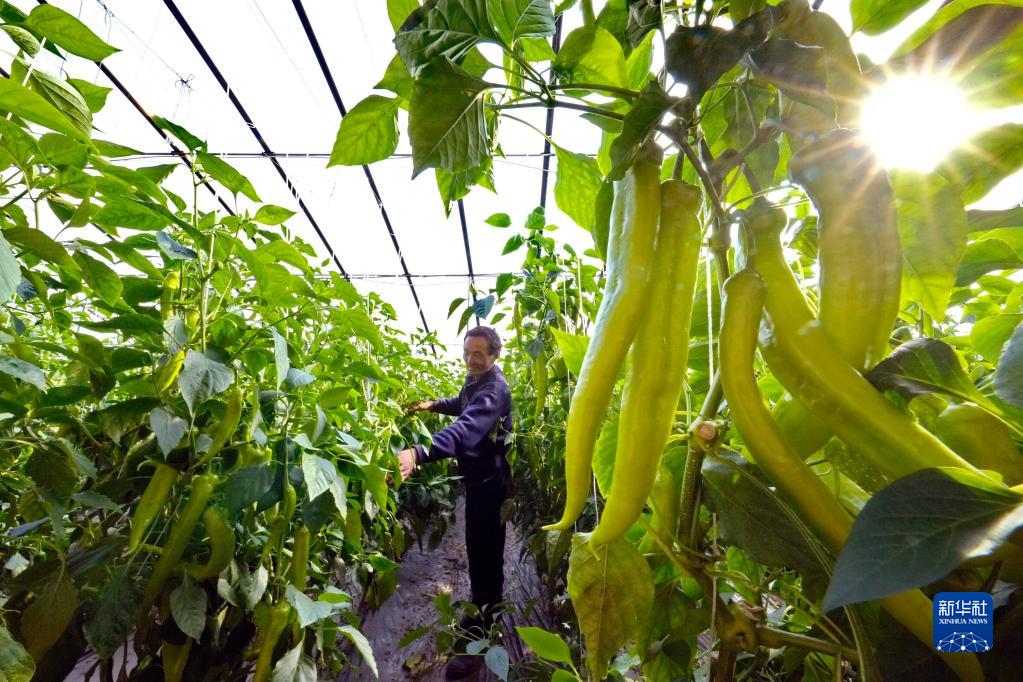 3月15日,河北省樂亭縣一家農業開發企業的工人在大棚內打理種植的辣椒。