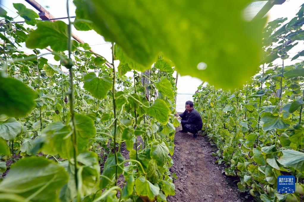 3月15日,河北省樂亭縣汀流河鎮劉石各莊村農民在大棚內打理種植的甜瓜。