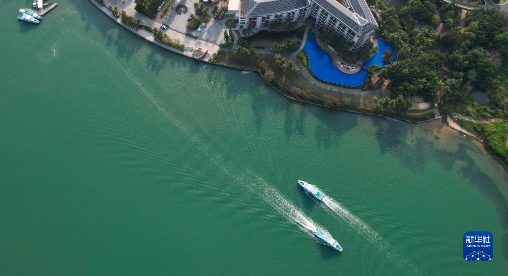 兩艘游船在博鰲東嶼島旅游度假區相向而行(3月14日攝,無人機照片)。