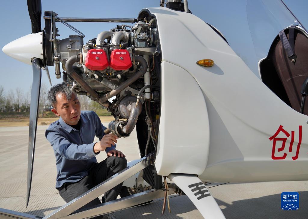 3月14日,在洛陽市宜陽縣的飛行營地,楊世誼在進行旋翼機飛行后檢查。