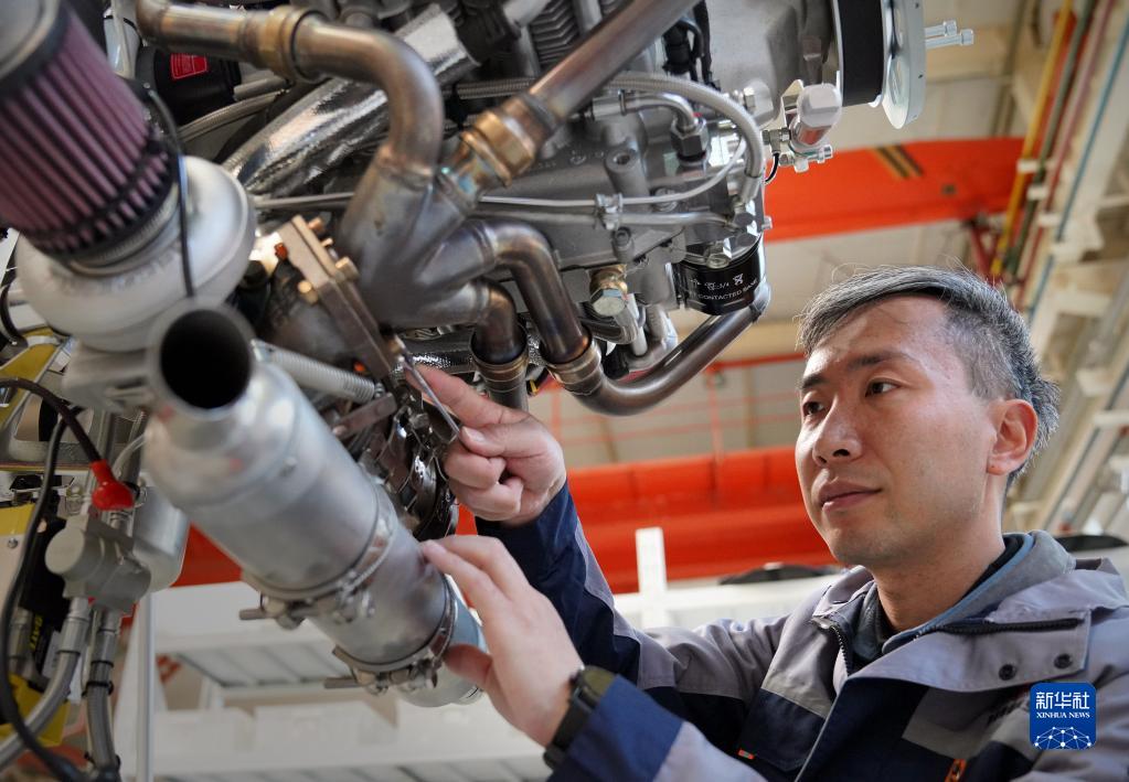 3月14日,在位于洛陽市的生產車間內,楊世誼在安裝發動機排氣管。