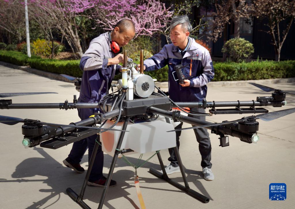 3月14日,在位于洛陽市的生產車間外,楊世誼(右)和員工在無人機起飛前進行設備檢查。