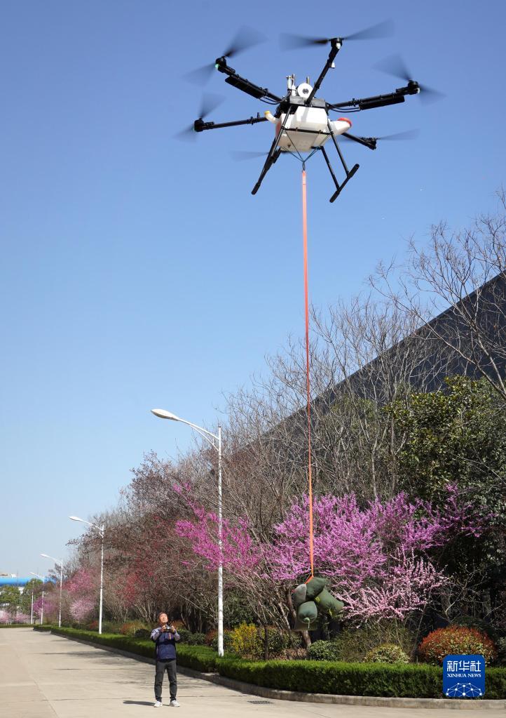 3月14日,在位于洛陽市的生產車間外,楊世誼對無人機進行吊裝載重測試。