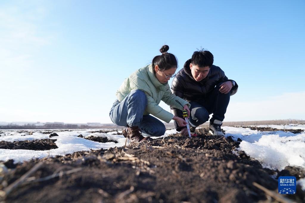 3月14日,在北大荒集團建設農場有限公司農業科技園區試驗田,孫凡紅(左)與同事測量融雪期土壤融化深度情況。