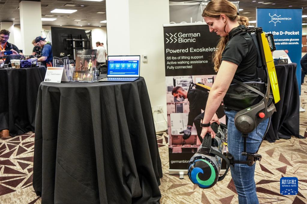 3月11日,在“西南偏南”大會和藝術節上,一位參與者正在體驗“仿生外骨骼”,它可以保護人體并幫助人們舉起重物。