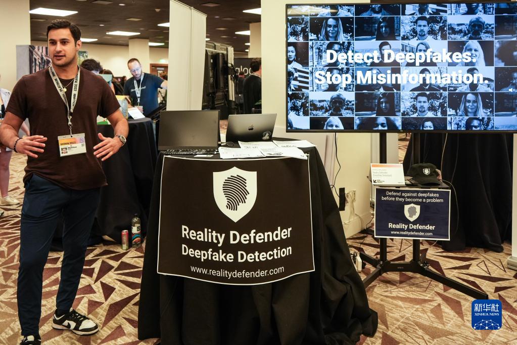 3月11日,在“西南偏南”大會和藝術節上,一名工作人員正在介紹“真相捍衛者”技術,該技術可為企業和實體提供網絡保護,防止其遭受“深度偽造”和自動生成內容的欺詐與破壞。