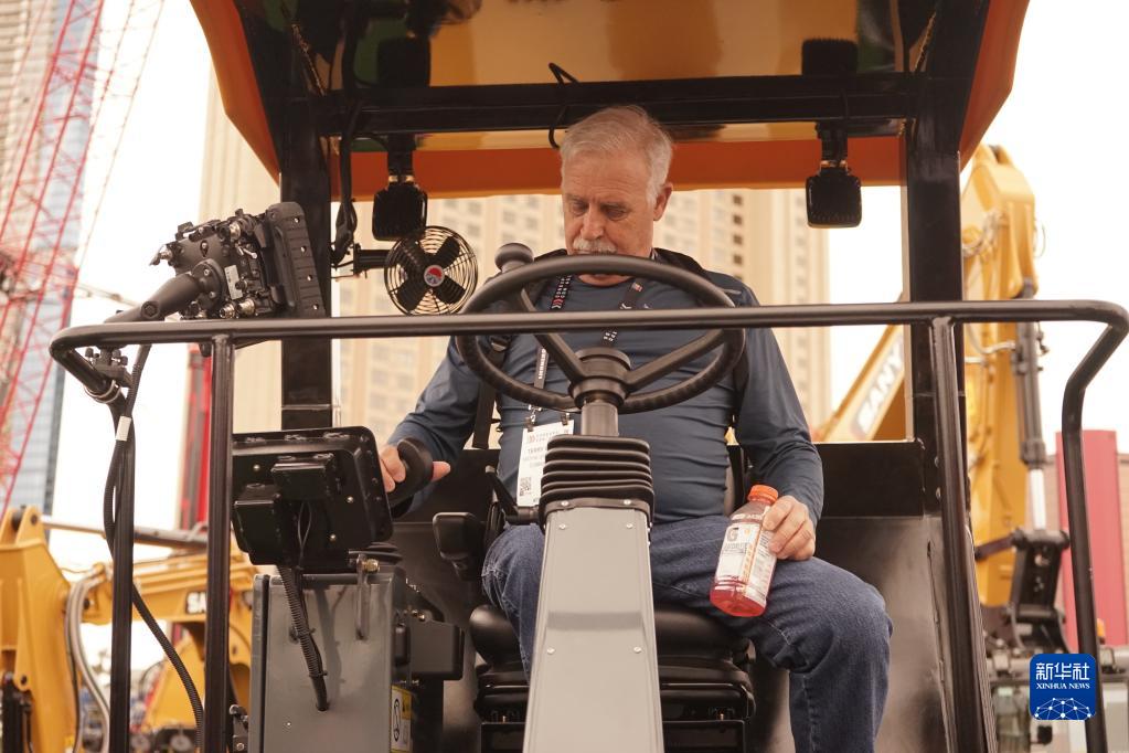 3月14日,一位參觀者在拉斯維加斯工程機械展上試駕中國企業三一重工的設備。