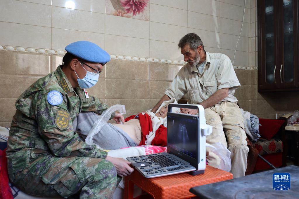3月13日,在黎巴嫩南部邊境地區卡法哈馬村,中國維和醫療分隊隊員為病人做檢查。