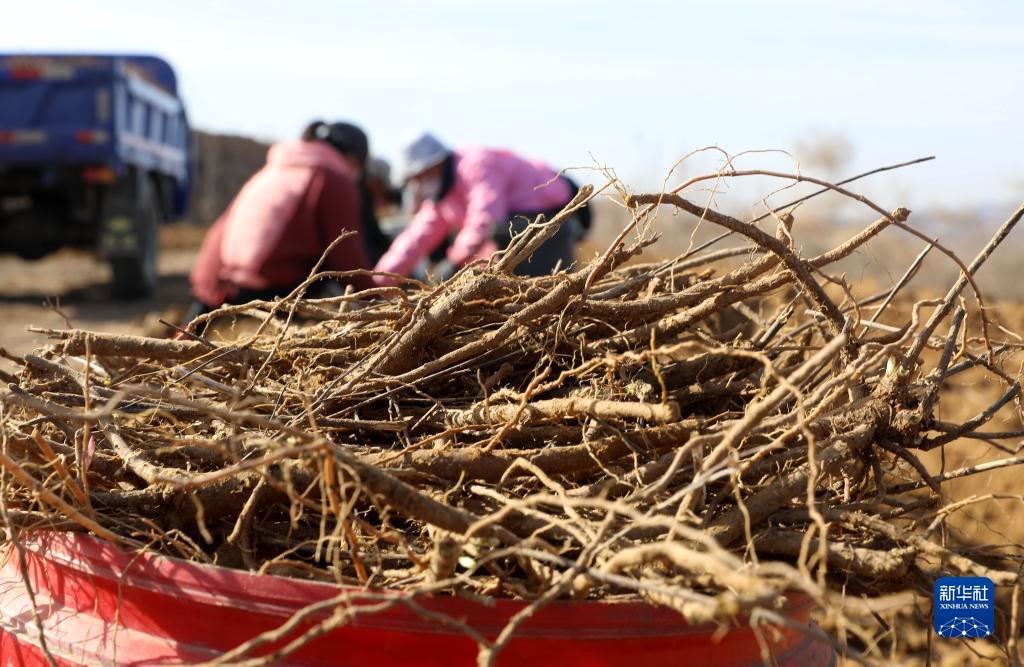 3月15日,在河北省石家莊市行唐縣上閆莊鄉中藥材種植基地,農戶在采收黃芩。
