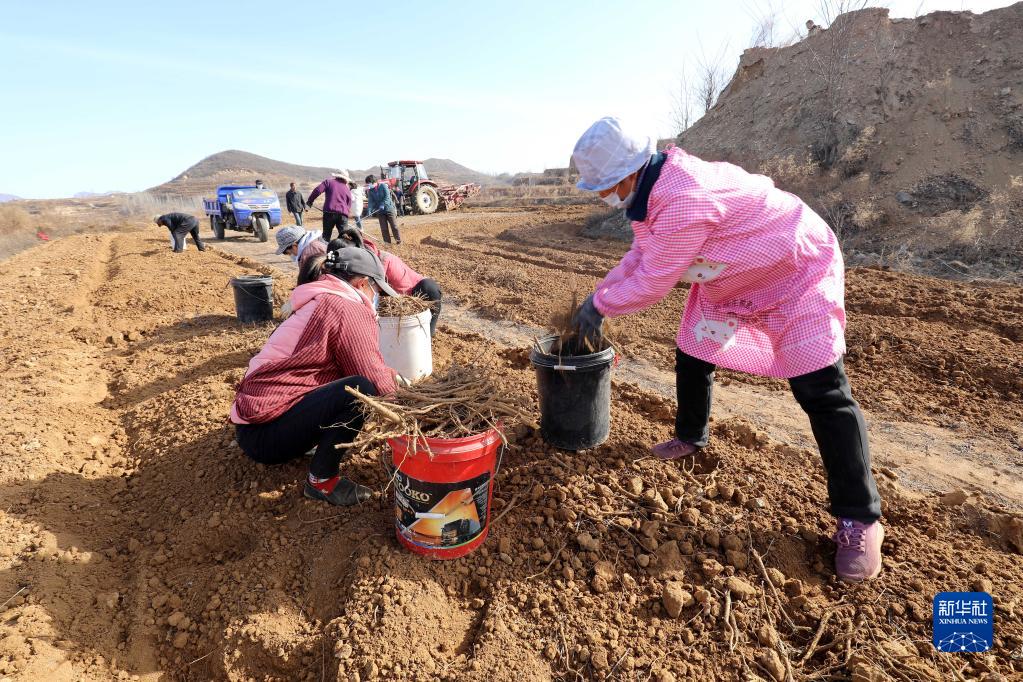 3月15日,在河北省石家莊市行唐縣上閆莊鄉中藥材種植基地,農戶在采收黃芩。