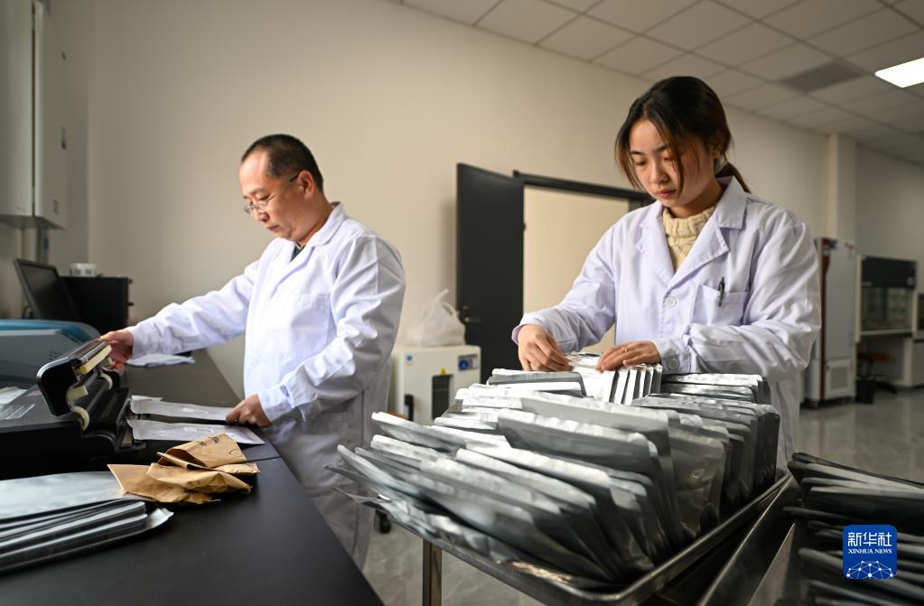 3月14日,在天津市農業科學院種質資源與生物技術研究所,科研人員對待入庫種質資源進行封裝。