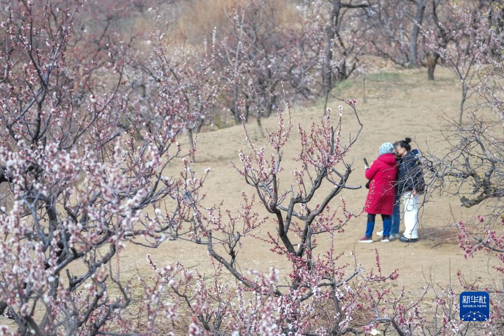 3月15日,游客在濟南長清區萬畝杏園內觀賞杏花。