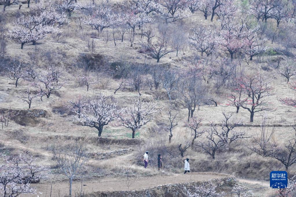 當日,山東省濟南市長清區張夏街道近萬畝杏花綻放,吸引游客前來觀賞游玩。