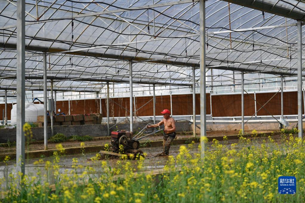 3月15日,在向陽紅現代農業智能化集中育秧工廠,農民操作手扶拖拉機翻耕土地。