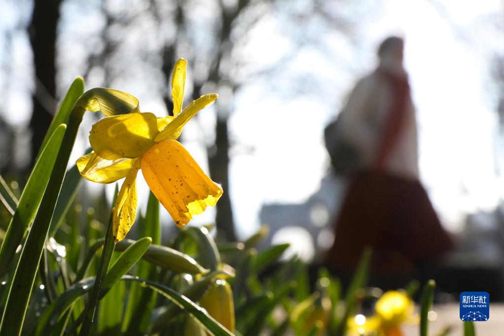 3月15日,一名行人經過比利時布魯塞爾五十周年紀念公園綻放的水仙花。
