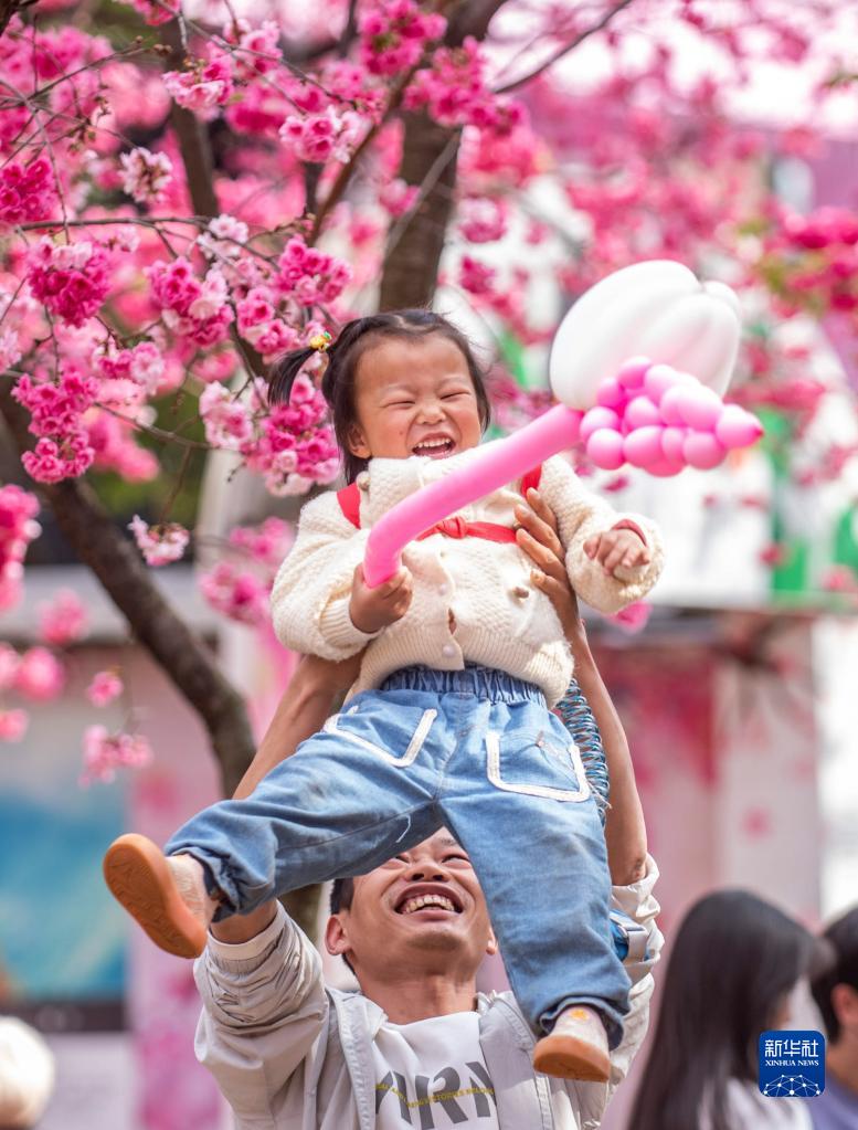 3月15日,一名游客抱著孩子在櫻花樹下玩耍。